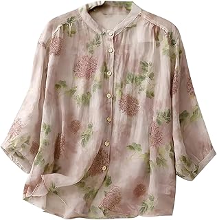 Women’s Light Rose Floral Printed Button Down Shirt with Mandarin Collar and Relaxed Fit 3/4 Sleeves