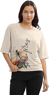 Beige Printed Loose Fit Crew-Neck Crop T-Shirt for Women