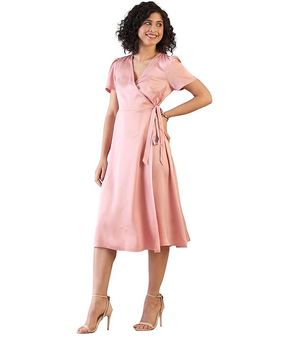 Pink Half Sleeve V-Neck Pink Wrap Dress