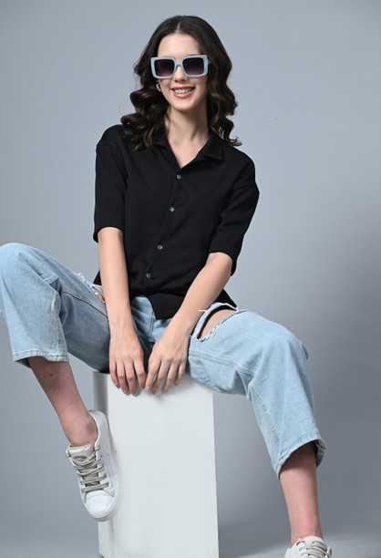 Women Regular Fit Solid Curved Collar Casual Shirt