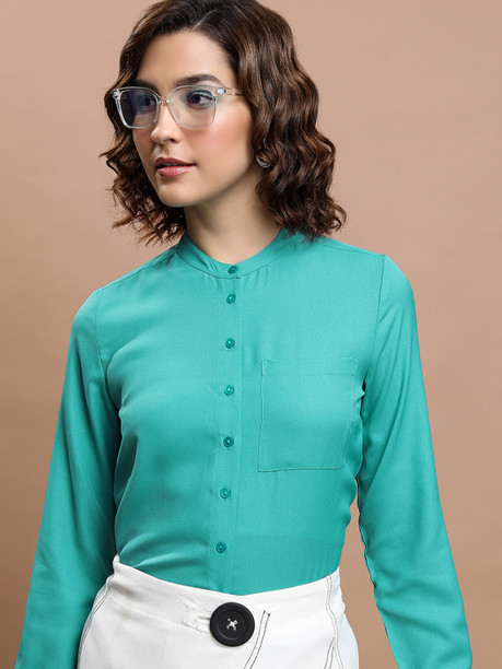Women Regular Fit Solid Mandarin Collar Casual Shirt