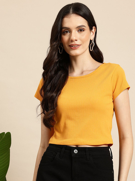 Women Self Design Round Neck Pure Cotton Yellow T-Shirt