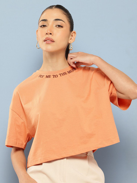 Women Solid Round Neck Cotton Blend Orange T-Shirt