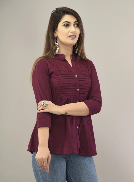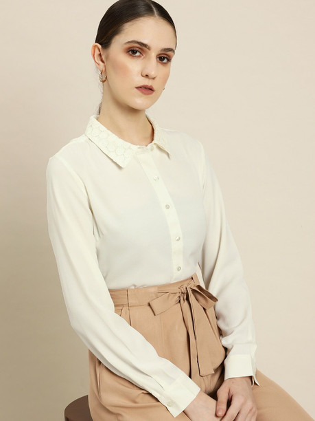Women Regular Fit Solid Cut Away Collar Casual Shirt