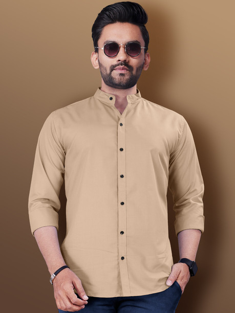 Men Regular Fit Solid Mandarin Collar Casual Shirt
