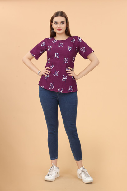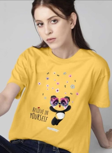 Women Printed Round Neck Cotton Blend Yellow T-Shirt