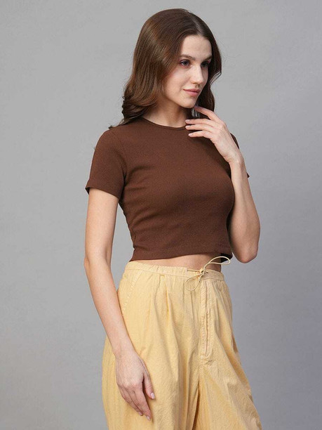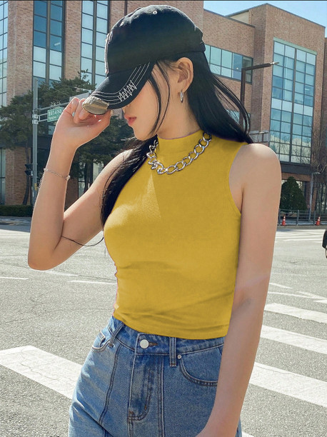 Women Solid High Neck Cotton Blend Yellow T-Shirt