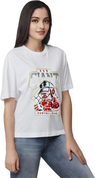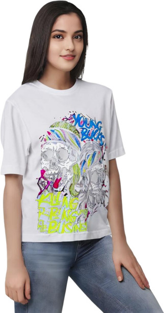 Women Printed Round Neck Cotton Blend White T-Shirt